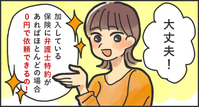 「弁護士費用が心配…」という方でも、弁護士費用特約が付いている自動車保険に加入していれば安心です。