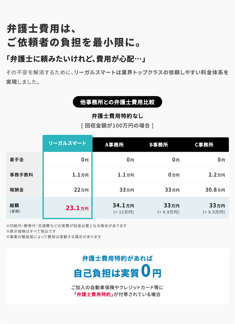 | 報酬金 | ■弁護士費用特約に加入していない方 回収金の11% + 110,000円 ■弁護士費用特約に加入している方 通常ご自身の負担はございません。 特約が適用され、補償限度額の範囲内であれば弁護士費用は保険会社が負担します。 (220,000円〜 ※回収見込み額によって変動します) |