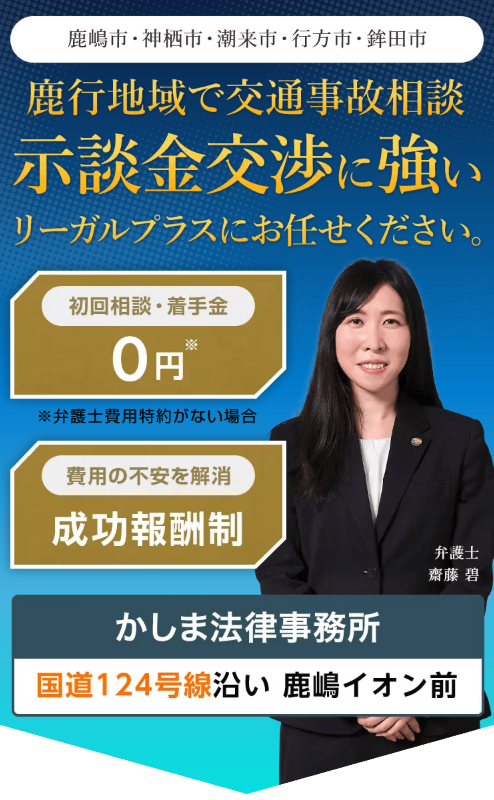 【相談料・着手金:0円、成功報酬制、賠償金の適正診断:0円】3,000件を超える相談実績と解決事例も豊富な交通事故に強いリーガルプラスは、事故直後から保険会社との示談交渉まで、ご依頼者に寄り添い丁寧にサポートいたします。【鹿嶋・神栖・鉾田・銚子・潮来・行方・稲敷など、茨城県を中心に対応】