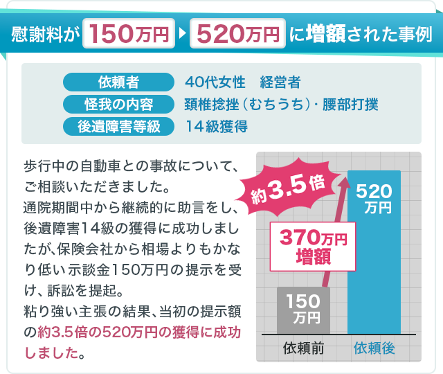 交通事故分野は、医療や保険など法律以外の知識も必要になり、弁護士の経験が問題解決の結果(示談金の額等)に影響しやすいです。